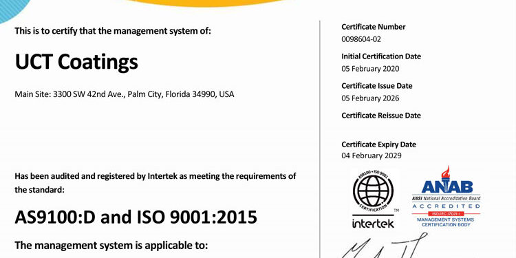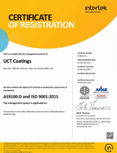UCT Coatings is proud to announce that our Quality Management System has once again been certified as being in conformity with AS-9100:D. UCT has been audited and registered by Intertek as meeting the requirements for AS9100:D and ISO 9001:2015 standards.